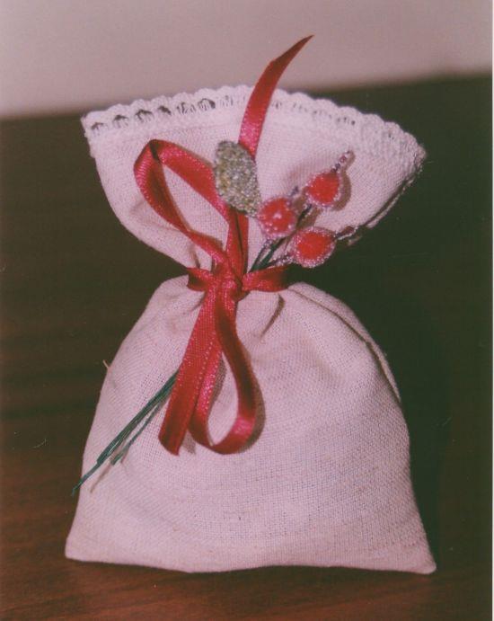 Sacchetto grande, tessuto di lino con puntina. Completo di nastrino di raso ,fiori assortiti n° 3 .