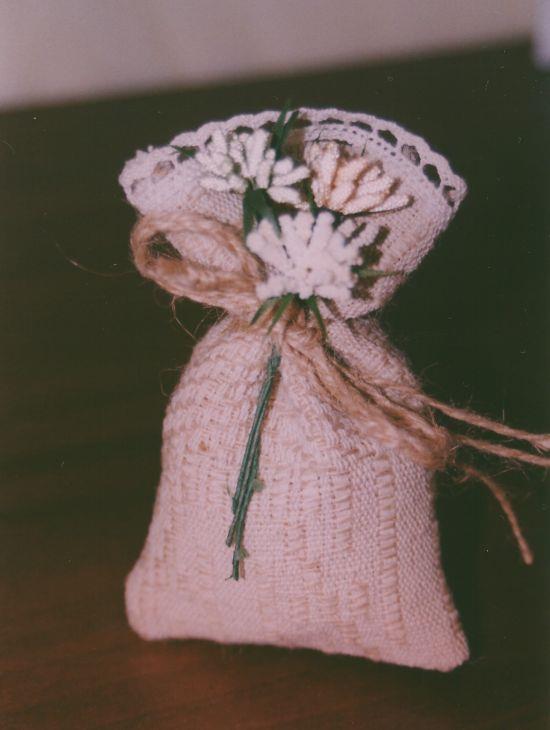 Sacchetto medio, di juta con puntina. Completo di cordoncino di iuta , fiori assortiti n° 3 .