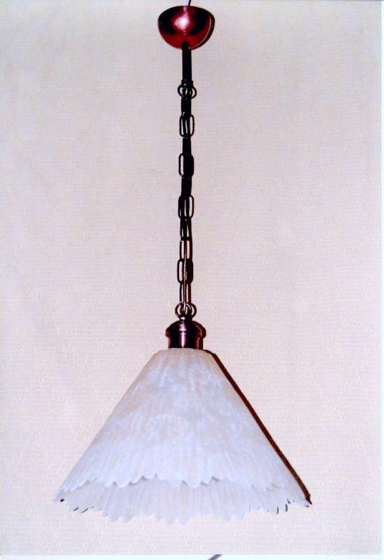 Lampadario pendente ad una luce in rame, con vetro rosato smerlato satinato realizzato artigianalmente, la parte centrale e retta da un'asse in catena fissata al rosone, il tutto si sviluppa con armonia ed eleganza. Ogni manufatto viene lavorato interamente a mano, il rame non si ossida rimane inalterato nel tempo, tutti i pezzi sono unici.