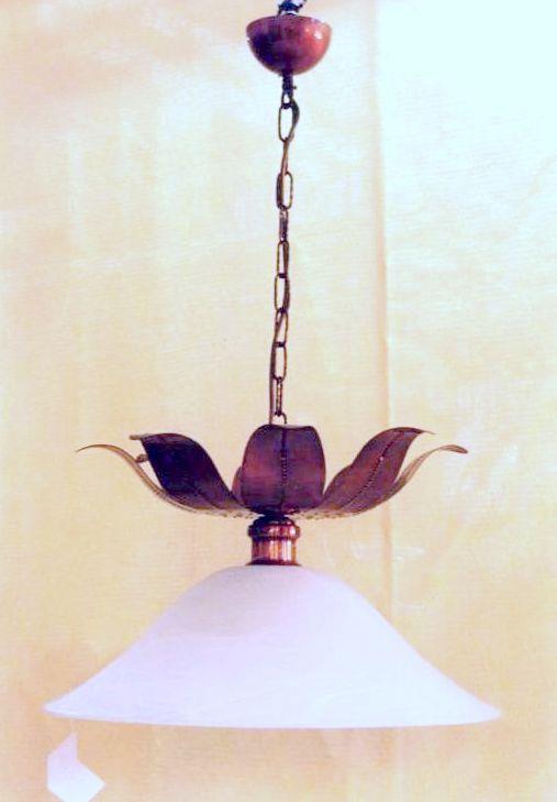Lampadario pendente ad una luce in rame, con un fiore grande centrale in rame, cesellato, puntinato, imbrunito, lucidato e vetro bianco satinato realizzato artigianalmente, la parte centrale e retta da un'asse in catena fissata al rosone, il tutto si sviluppa con armonia ed eleganza. Ogni manufatto viene lavorato interamente a mano, il rame non si ossida rimane inalterato nel tempo, tutti i pezzi sono unici.