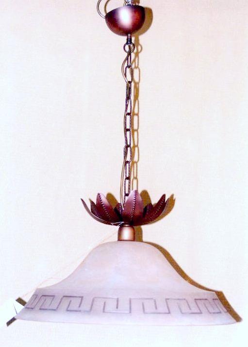 Lampadario pendente ad una luce in rame, con un fiore medio centrale in rame, cesellato, puntinato, imbrunito, reso opaco e vetro rosato con greca, satinato realizzato artigianalmente, la parte centrale e retta da un'asse in catena fissata al rosone, il tutto si sviluppa con armonia ed eleganza. Ogni manufatto viene lavorato interamente a mano, il rame non si ossida rimane inalterato nel tempo, tutti i pezzi sono unici.