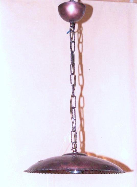 Lampadario pendente ad una luce in rame reso opaco, disco interamente martellato e sbalzato a mano la parte centrale e retta da un'asse in catena fissata al rosone, il tutto si sviluppa con armonia ed eleganza. Ogni manufatto viene lavorato interamente a mano, il rame non si ossida rimane inalterato nel tempo, tutti i pezzi sono unici e firmati dal maestro.