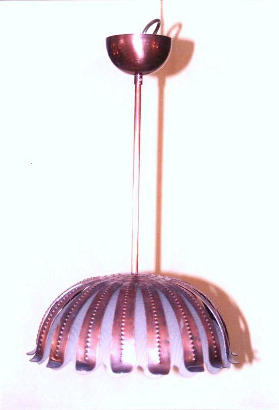 Lampadario pendente ad una luce in rame reso opaco, parte esterna interamente in rame a forma di fiore, cesellato, puntinato ed imbrunito e reso opaco che sovrasta tutto il lampadario,  inserito internamente il vetro satinato di colore bianco con bordo ad archetti che va ad accompagnare il fiore in rame. La parte centrale e retta da un'asse in rame fissato al rosone, il tutto si sviluppa con armonia ed eleganza. Ogni manufatto viene lavorato interamente a mano, il rame non si ossida rimane inalterato nel tempo, tutti i pezzi sono unici e firmati dal maestro.