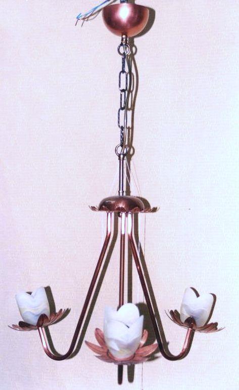 Lampadario pendente a tre luci in rame reso lucido, formato da tre fiori con tre bracci a sua volta collegate al centro da un fiore interamente in rame, cesellato, puntinato ed imbrunito e reso opaco, che armonizza il lampadario. I vetri sono di colore bianco satinato. La parte centrale e retta da un'asse in catena fissata al rosone, il tutto si sviluppa con armonia ed eleganza. Ogni manufatto viene lavorato interamente a mano, il rame non si ossida rimane inalterato nel tempo, tutti i pezzi sono unici e firmati dal maestro.
