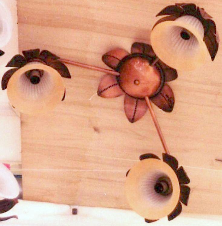 Lampadario a tetto a tre luci in rame reso opaco, formato da tre fiori con tre bracci a sua volta collegate al centro da un fiore interamente in rame, cesellato, puntinato ed imbrunito e reso opaco, che armonizza il lampadario. I vetri sono di colore rosato sfumato satinato. il tutto si sviluppa con armonia ed eleganza. Ogni manufatto viene lavorato interamente a mano, il rame non si ossida rimane inalterato nel tempo, tutti i pezzi sono unici e firmati dal maestro.