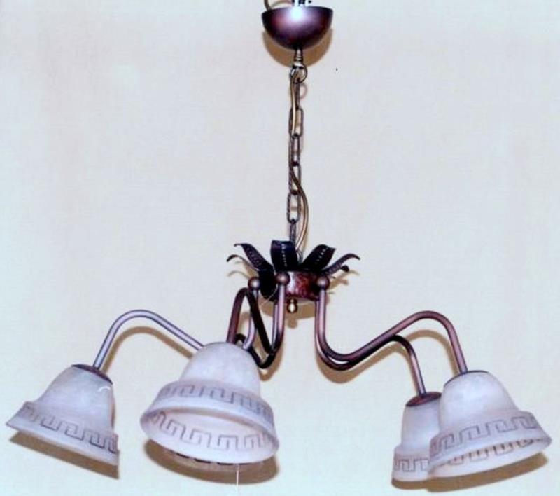 Lampadario pendente a cinque luci in rame reso opaco, formato da cinque bracci collegate al centro da un fiore interamente in rame, cesellato, puntinato ed imbrunito e reso opaco, che armonizza il lampadario. I vetri sono di colore rosato  satinato con greca per tutta la circonferenza.La parte centrale e retta da un'asse in catena fissata al rosone, il tutto si sviluppa con armonia ed eleganza. Ogni manufatto viene lavorato interamente a mano, il rame non si ossida rimane inalterato nel tempo, tutti i pezzi sono unici e firmati dal maestro.