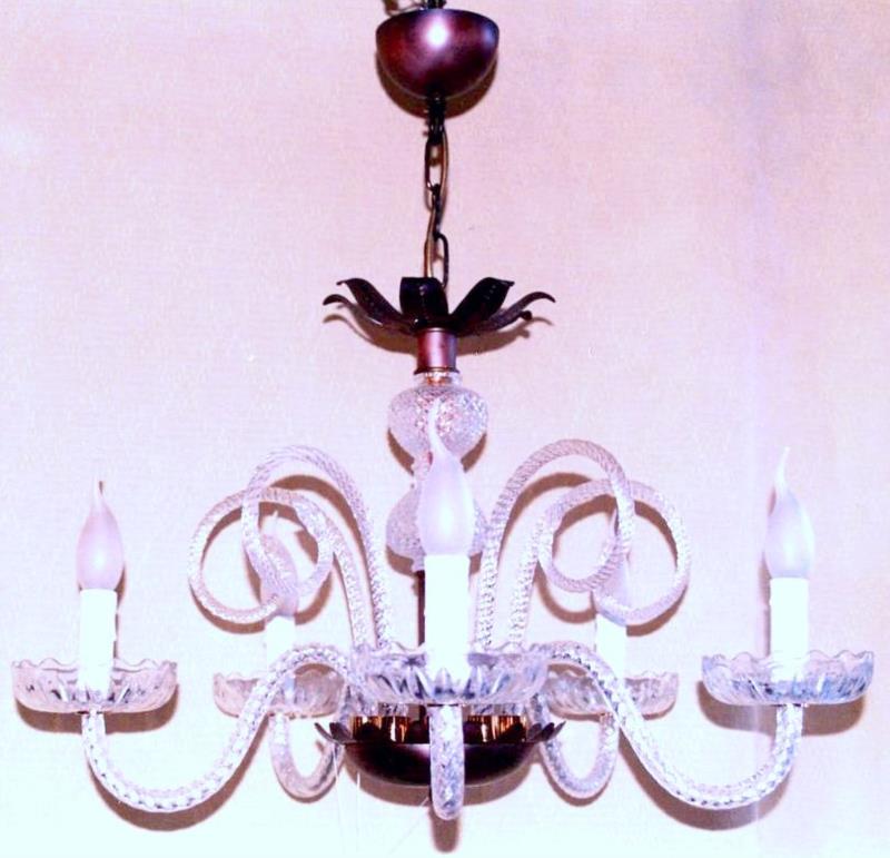 Lampadario pendente a cinque luci in cristallo e rame reso opaco, formato da cinque bobesc e bracci a sua volta collegate al centro da un fiore interamente in rame lavorato, cesellato, puntinato ed imbrunito e reso opaco, ad esso sono ineriti anche cinque pastorali in cristallo che armonizzano il lampadario. Nella parte centrale sono inserite due ampolle in cristallo, che le sovrasta un fiore in rame a sua volta retto da un'asse in catena fissata al rosone, il tutto si sviluppa con armonia ed eleganza. Ogni manufatto viene lavorato interamente a mano, il rame non si ossida rimane inalterato nel tempo, tutti i pezzi sono unici e firmati dal maestro.