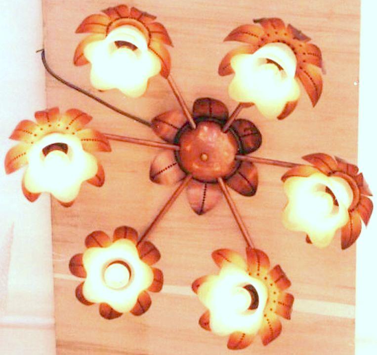Lampadario a tetto a sei luci in rame reso opaco, formato da sei fiori con sei bracci a sua volta collegate al centro da un fiore interamente in rame, cesellato, puntinato ed imbrunito e reso opaco, che armonizza il lampadario. I vetri sono di colore rosato sfumato satinato. il tutto si sviluppa con armonia ed eleganza. Ogni manufatto viene lavorato interamente a mano, il rame non si ossida rimane inalterato nel tempo, tutti i pezzi sono unici e firmati dal maestro.