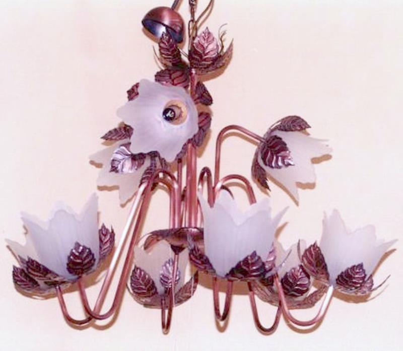 Lampadario pendente a nove luci in rame reso lucido, formato da nove fiori intagliati con nove bracci a sua volta collegate al centro da un fiore intagliato il tutto e interamente in rame, cesellato, puntinato ed imbrunito e reso opaco. I vetri sono di colore bianco satinato a punta. Il tutto si sviluppa su due piani, in quello inferiore ci sono sei luci, in quello superiore tre luci. Il lampadario è maestoso, armonioso ed eleganza. Ogni manufatto viene lavorato interamente a mano, il rame non si ossida rimane inalterato nel tempo, tutti i pezzi sono unici e firmati dal maestro.