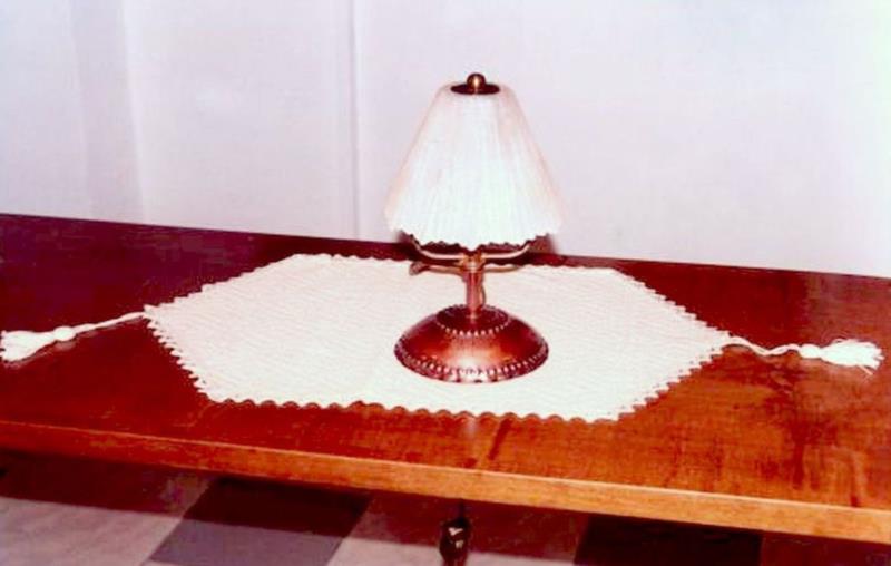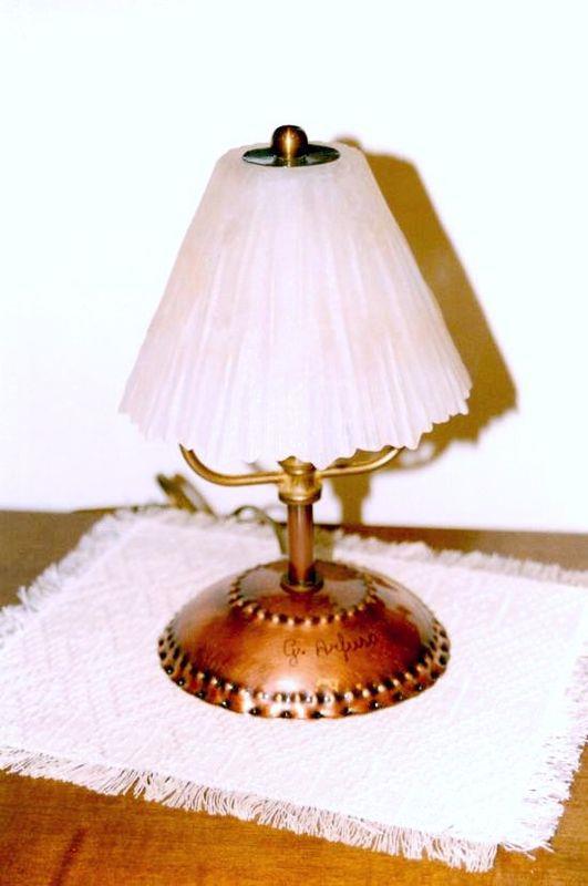Lume in rame con base in rame puntinata, sbalzata con stelo in rame reso lucido in cui sovrasta il vetro di colore rosato satinato e smerlato. Ogni manufatto viene lavorato interamente a mano, il rame non si ossida rimane inalterato nel tempo, tutti i pezzi sono unici e firmati dal maestro.