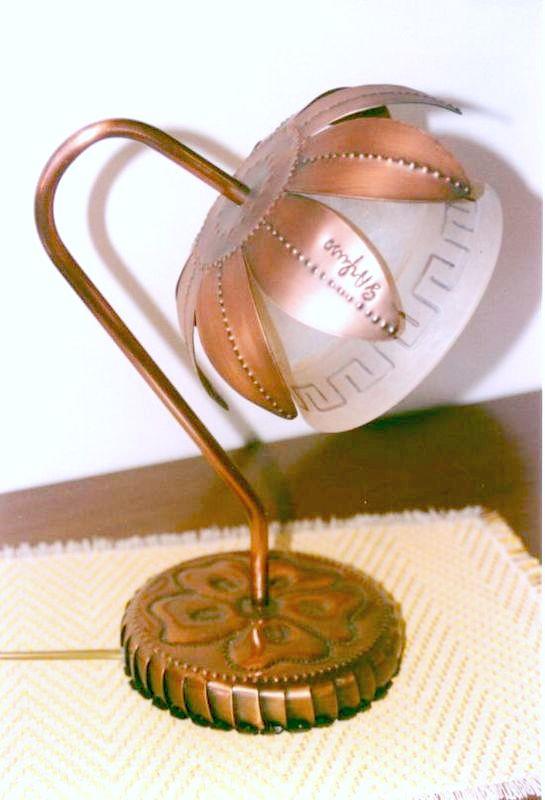 Abat jour in rame, cesellata puntinata. Il rame viene lavorato interamente a mano.L'interno della base e in ferro quindi molto pesante in modo che al contatto non si muova. Non si ossida quindi rimane inalterata nel tempo. Ogni opera viene firmata dal maestro.