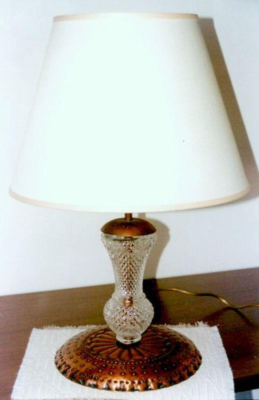 Lume in rame, cristallo e tessuto con base cesellata, sbalzata ed imbrunita con stelo in rame reso il tutto opaco ed un fusto in cristallo in cui sovrasta il paralume in tessuto avorio. Ogni manufatto viene lavorato interamente a mano, il rame non si ossida rimane inalterato nel tempo, tutti i pezzi sono unici e firmati dal maestro.