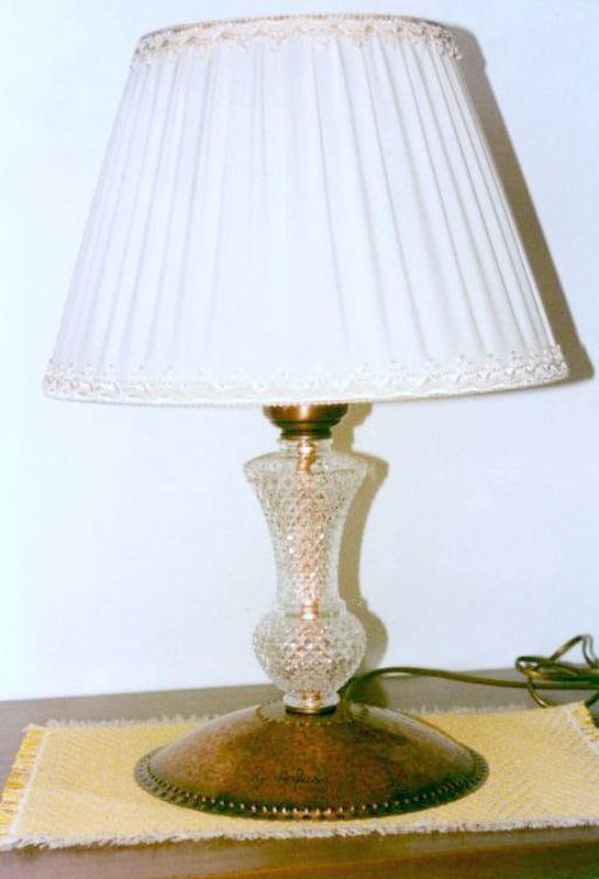 Lume in rame, cristallo e tessuto con base cesellata, sbalzata ed imbrunita con stelo in rame reso il tutto opaco ed un fusto in cristallo in cui sovrasta il paralume in tessuto avorio pieghettato. Ogni manufatto viene lavorato interamente a mano, il rame non si ossida rimane inalterato nel tempo, tutti i pezzi sono unici e firmati dal maestro.