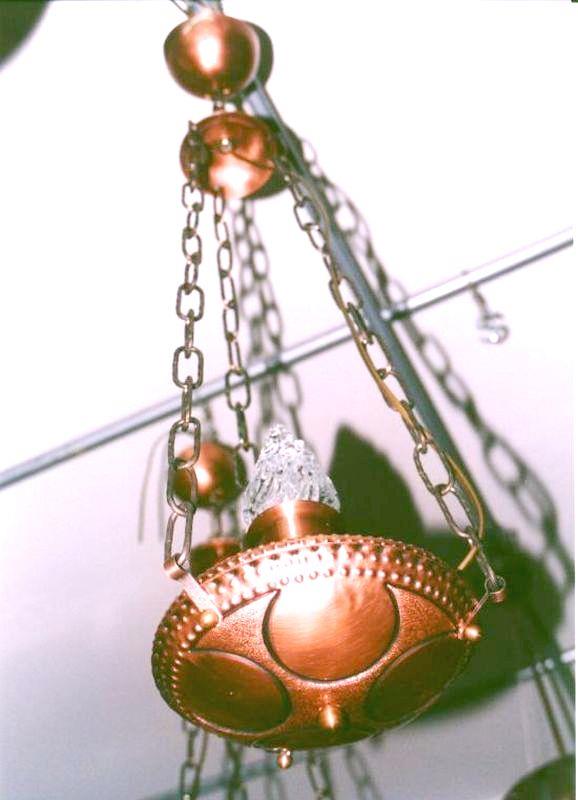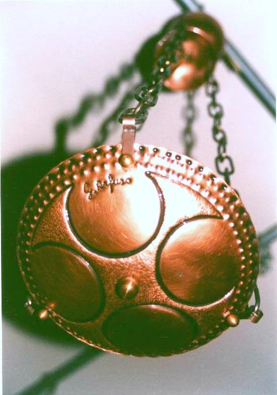 Lampada pendente ad una luce in rame con motivi cerchi in tutta la parte centrale e retto da tre assi di catena fissati al rosone, il tutto si sviluppa con armonia ed eleganza. Ogni manufatto viene lavorato interamente a mano, il rame non si ossida rimane inalterato nel tempo, tutti i pezzi sono unici e vengono firmati dall'artista