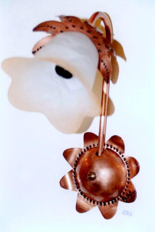 Applique a braccio a 1 luce con  curve, si può montare direzionando la luce sia verso l'alto che verso il basso, è formato da due foglie cesellate. Il rame viene lavorato interamente a mano, non si ossida quindi rimane inalterata nel tempo. Ogni opera viene firmata dal maestro.