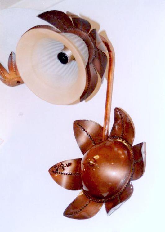 Applique a braccio a 1 luce grande con  curve, si può montare direzionando la luce sia verso l'alto che verso il basso, è formato da due foglie cesellate. Il rame viene lavorato interamente a mano, non si ossida quindi rimane inalterata nel tempo. Ogni opera viene firmata dal maestro.