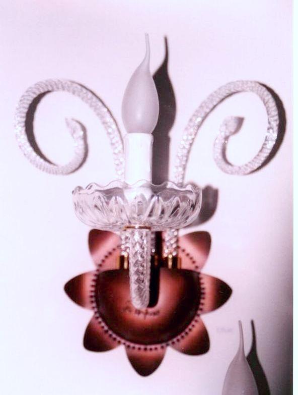 Applique in rame e cristallo, ad una luce centrale. Fiore di base in rame intagliato a mano, il rame non si ossida, abbiamo inserito bobesc e pastorali in cristallo. Ogni manufatto viene firmato dal maestro, sono tutti pezzi unici.