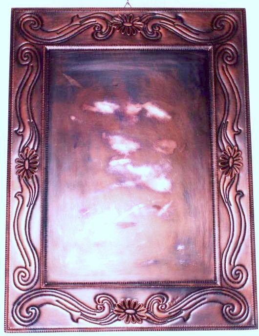 Specchio rettangolare in rame, motivo floreale barocco lavorato interamente a mano, cesello e sbalzo, martellato, puntinato e imbrunito e reso opaco. Curato nei minimi particolari, mentre per tutto il perimetro segue il motivo decorativo, con un certo schema. Lo specchio è realizzato con unica lastra in rame, è armonioso ed elegante. Ogni opera viene lavorato interamente a mano, il rame non si ossida rimane inalterato nel tempo, tutti i pezzi sono unici e firmati dal maestro.