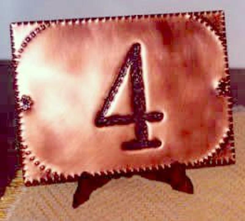 Numeri ad una cifra eseguiti interamente a mano, vengono tutti puntinati, sbalzati,  piegati e forati per fissarli alla parete. Non si ossida, anche a contatto con l'acqua o la salsedine, rimane inalterato nel tempo. I numeri vanno su richiesta. Escluso cavalletto.