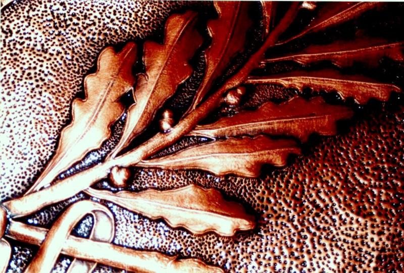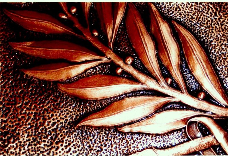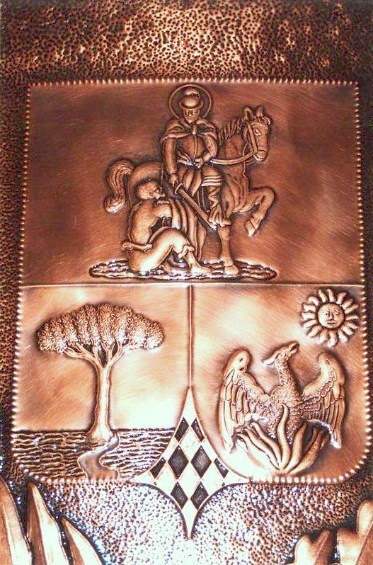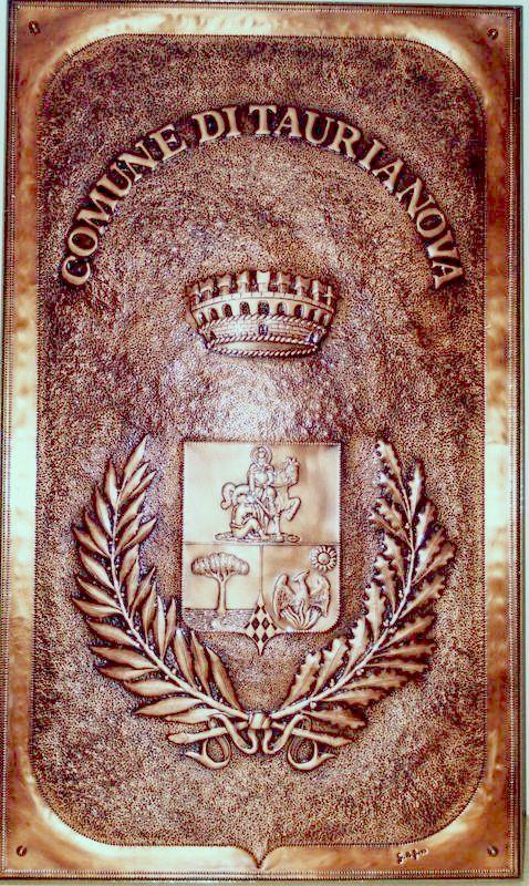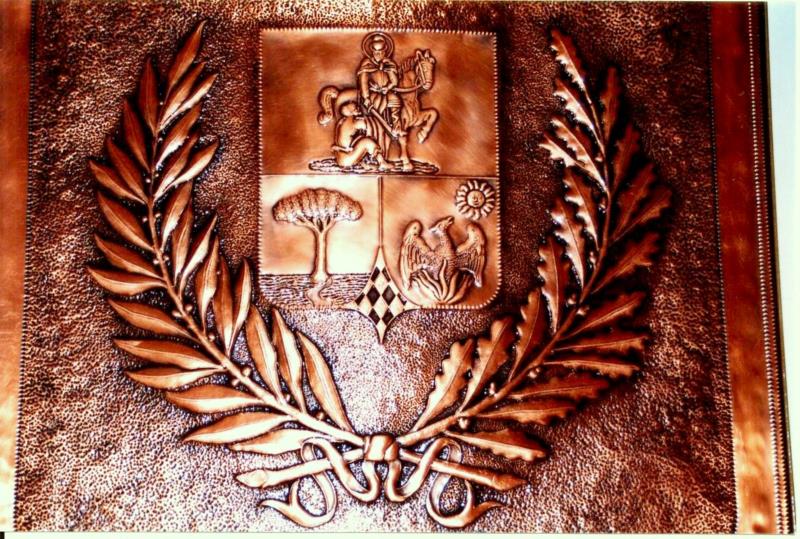 Lo stemma comunale è lavorato a mano, con il seguente procedimento, viene eseguito il progetto, riportato sul rame attraverso il foglio lucido. Viene eseguito il cesello lo sbalzo la puntinatura la martellatura, viene lavorato sia dal diritto che dal rovescio.La lastra viene piegata lateralmente eseguita la chiusura, viene imbrunito, lucidato per poi passare alla fase finale, in questo caso viene reso opaco. Ogni manufatto viene realizzato interamente a mano, non si ossida anche a contatto con l'acqua, rimane inalterato nel tempo, tutti i pezzi vengono firmati dal maestro.