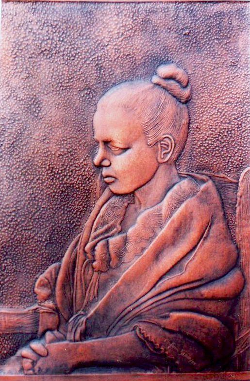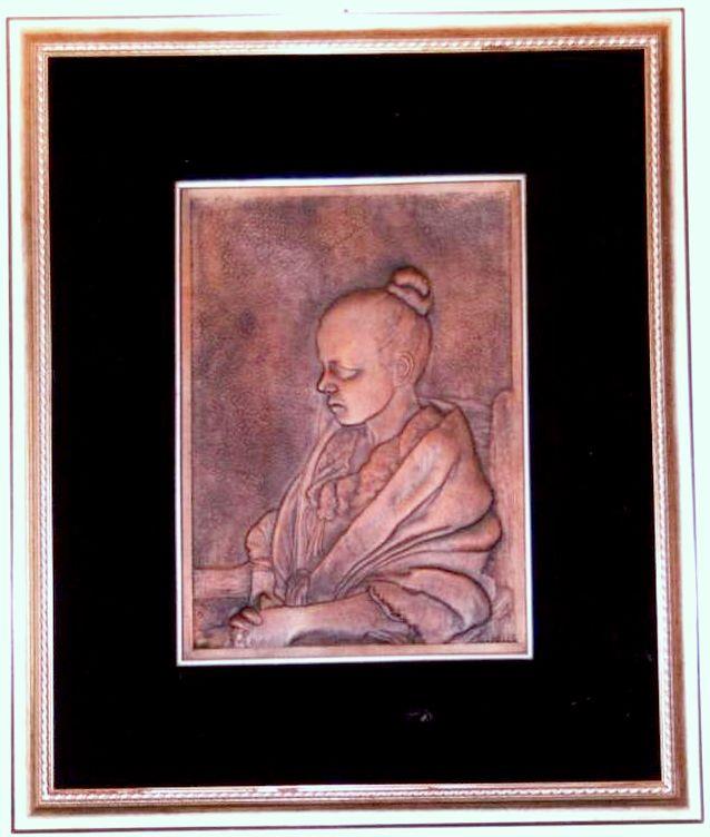 Quadro, ritratto, unico esemplare su rame, lavorato interamente a mano a sbalzo e cesello, puntinato, martellato, imbrunito e reso opaco. Curato nei minimi particolari, non solo nella figura, ma l'espressione del volto avvolta nei pensieri, molto curati gli abiti con i pizzi, morbidi nel panneggio con una linea fluida.