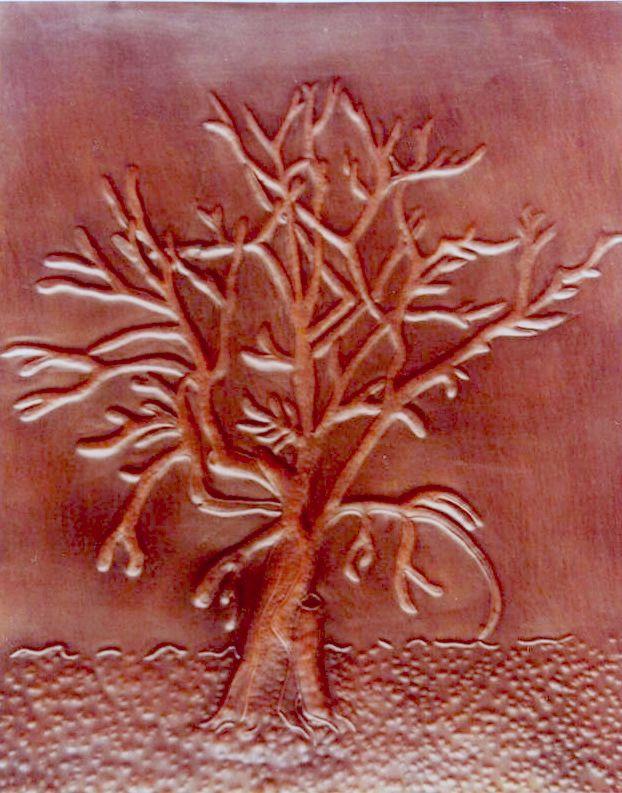 Quadro, La quercia, unico esemplare su rame, lavorato interamente a mano a sbalzo e cesello, martellato e imbrunito e reso opaco. Curato nei minimi particolari, con una linea fluida che investe tutto il quadro