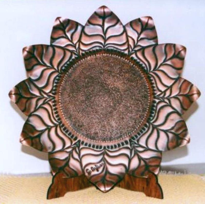 Centro tavolo in rame, girasole di misura ampia. La lavorazione è minuziosa, in ogni dettaglio. Smerlato rialzato, cesellato, sbalzato, puntinato, martellato ed imbrunito reso opaco, per tutta il centro tavolo e la circonferenza si sviluppa il motivo decorativo del girasole, che richiama le nostre distese fiorite, riscaldati dai raggi solari. Il centro tavolo è maestoso, armonioso ed elegante in cui la natura si impossessa del metallo.