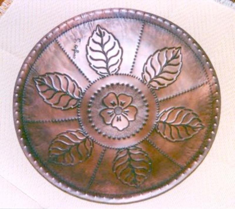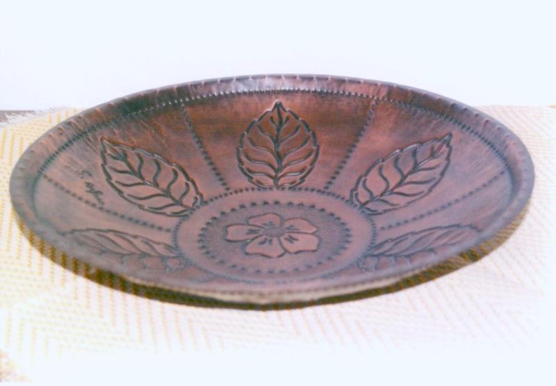 Centro tavolo in rame molto ampio con grandi foglie di nespolo e con fiore porta fortuna centrale sbocciato. E' lavorato con ogni cura, da mani sapienti che plasmano il metallo come fili d'oro. E' rialzato, cesellato, sbalzato, puntinato, martellato ed imbrunito reso opaco, per tutto il centro tavolo il motivo decorativo richiama la natura.