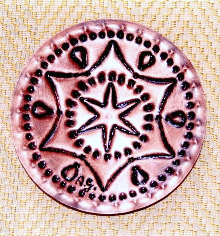 Piattino da appendere o appoggio in rame stella, puntinato, sbalzato e imbrunito, reso lucido, mentre per tutta la circonferenza è puntinato seguendo un certo ordine, motivo decorativo della Magna Grecia. Il manufatto è armonioso ed elegante.Ogni manufatto viene lavorato interamente a mano, il rame non si ossida rimane inalterato nel tempo, tutti i pezzi sono unici e firmati dal maestro. Completo di forellino per appendere.