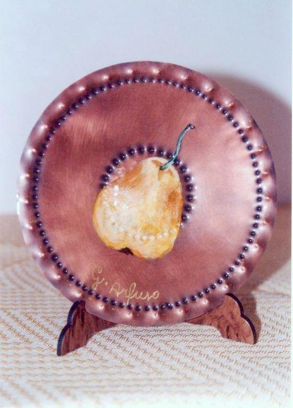 Piattino da appendere o appoggio in rame, frutta dipinto a mano, puntinato, sbalzato e imbrunito, reso opaco, mentre per tutta la circonferenza è puntinato seguendo un certo ordine, motivo decorativo della Magna Grecia. Il manufatto è armonioso ed elegante.Ogni manufatto viene lavorato interamente a mano, il rame non si ossida rimane inalterato nel tempo, tutti i pezzi sono unici e firmati dal maestro. Completo di forellino per appendere. Può essere usato anche come svuota tasche o contenere cioccolatini ecc..
