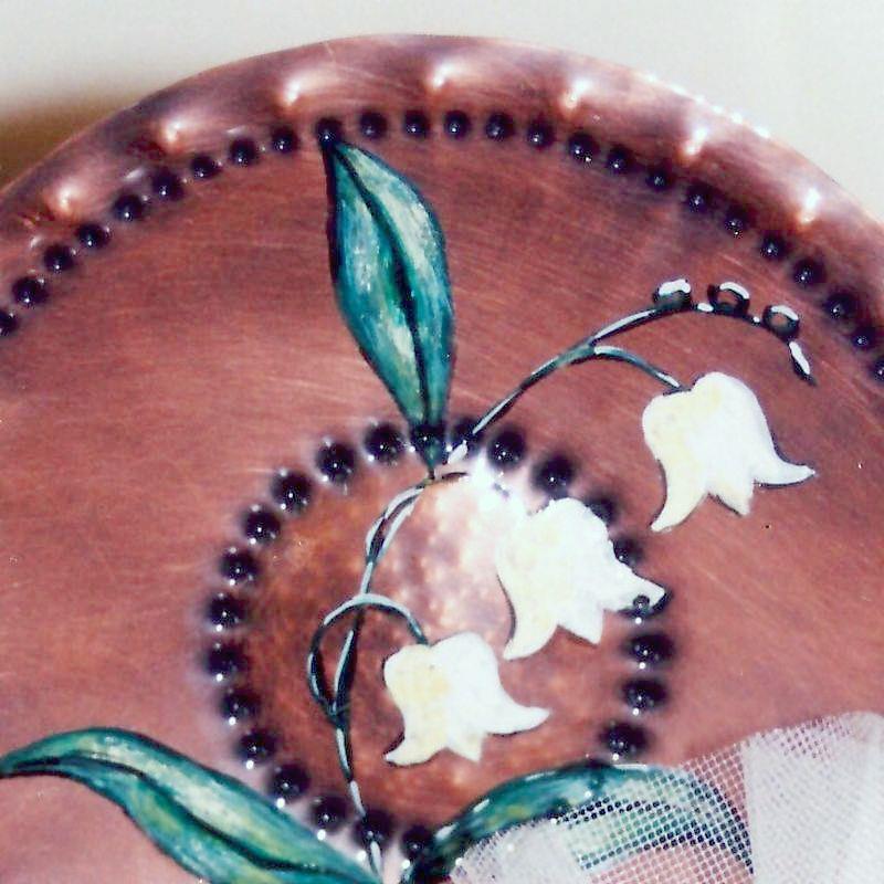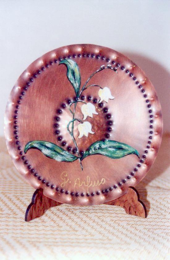 Piattino da appendere o appoggio in rame, mughetti dipinto a mano, puntinato, sbalzato e imbrunito, reso opaco, mentre per tutta la circonferenza è puntinato seguendo un certo ordine, motivo decorativo della Magna Grecia. Il manufatto è armonioso ed elegante.Ogni manufatto viene lavorato interamente a mano, il rame non si ossida rimane inalterato nel tempo, tutti i pezzi sono unici e firmati dal maestro. Completo di forellino per appendere. Può essere usato anche come svuota tasche o contenere cioccolatini ecc..