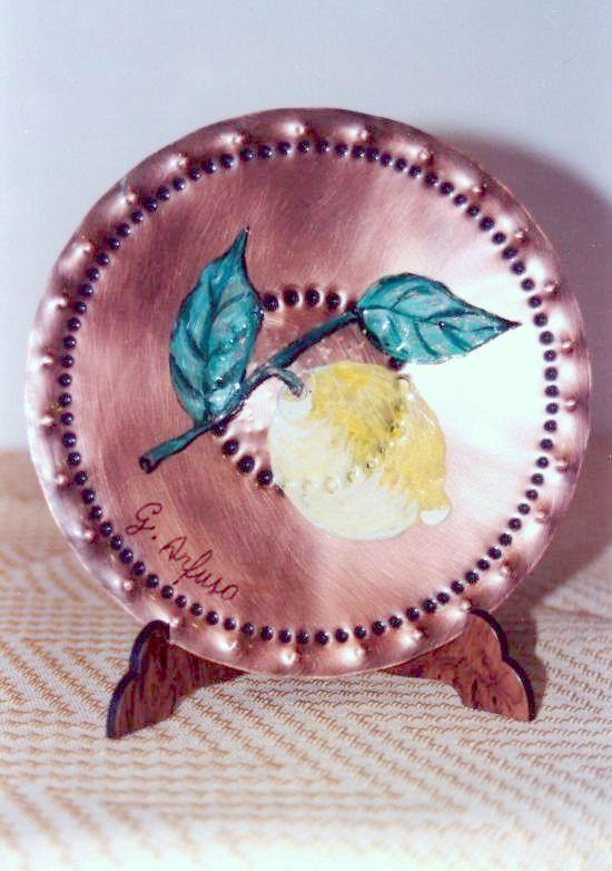 Piattino da appendere o appoggio in rame, limone dipinto a mano, puntinato, sbalzato e imbrunito, reso opaco, mentre per tutta la circonferenza è puntinato seguendo un certo ordine, motivo decorativo della Magna Grecia. Il manufatto è armonioso ed elegante.Ogni manufatto viene lavorato interamente a mano, il rame non si ossida rimane inalterato nel tempo, tutti i pezzi sono unici e firmati dal maestro. Completo di forellino per appendere. Può essere usato anche come svuota tasche o contenere cioccolatini ecc..