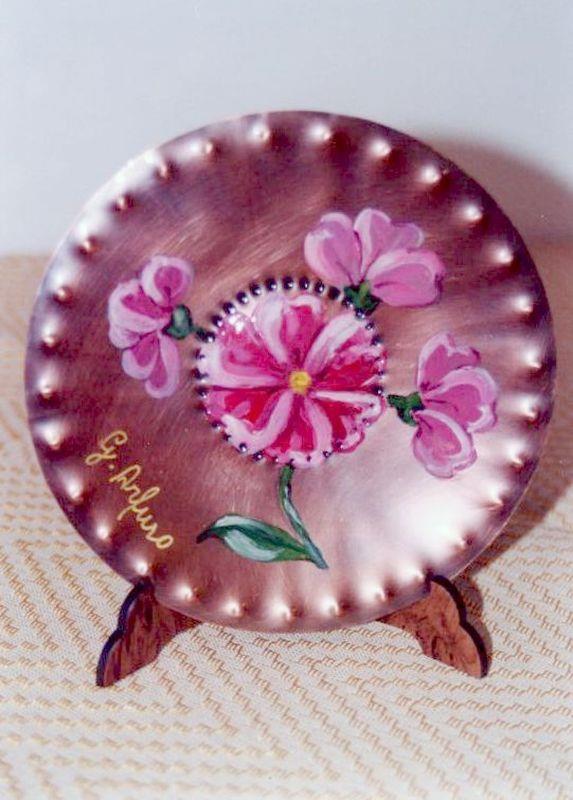 Piattino da appendere o appoggio in rame, fiori dipinto a mano, puntinato, sbalzato e imbrunito, reso opaco, mentre per tutta la circonferenza è puntinato seguendo un certo ordine, motivo decorativo della Magna Grecia. Il manufatto è armonioso ed elegante.Ogni manufatto viene lavorato interamente a mano, il rame non si ossida rimane inalterato nel tempo, tutti i pezzi sono unici e firmati dal maestro. Completo di forellino per appendere. Può essere usato anche come svuota tasche o contenere cioccolatini ecc..