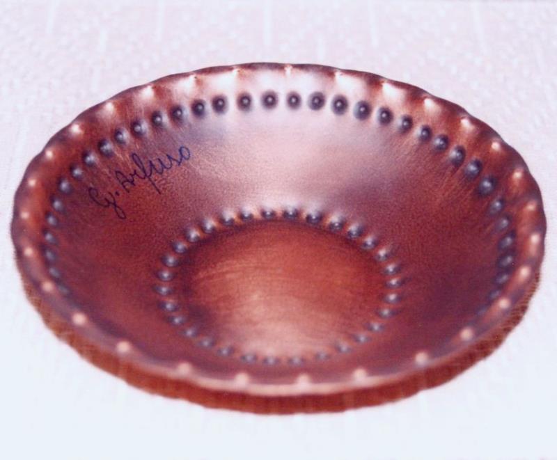 Piattino da appoggio in rame profondo, semplicemente! ciotola. Il lavoro eseguito è puntinato, sbalzato e imbrunito, reso opaco, mentre lo racchiude per tutta la circonferenza la puntinatura a doppio giro in positivo e negativo, motivo decorativo della Magna Grecia. Il manufatto è armonioso e realizzato per contenere, infatti si presta moltissimo per svuota tasche o porta dolcetti. Ogni oggetto viene lavorato interamente a mano, con molta cura. il metallo semi prezioso non si ossida, rimane inalterato nel tempo, tutti i pezzi sono unici e firmati dal maestro.