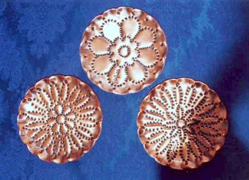 Piattini da appendere o appoggio in rame, puntinati, sbalzati e imbruniti, resi lucidi, anche per tutta la circonferenza è puntinato seguendo un certo ordine, motivo decorativo della Magna Grecia. Il manufatto è armonioso ed elegante.Ogni manufatto viene lavorato interamente a mano, il rame non si ossida rimane inalterato nel tempo, tutti i pezzi sono unici e firmati dal maestro. Completo di forellino per appendere. Può essere usato anche come svuota tasche o contenere cioccolatini ecc..