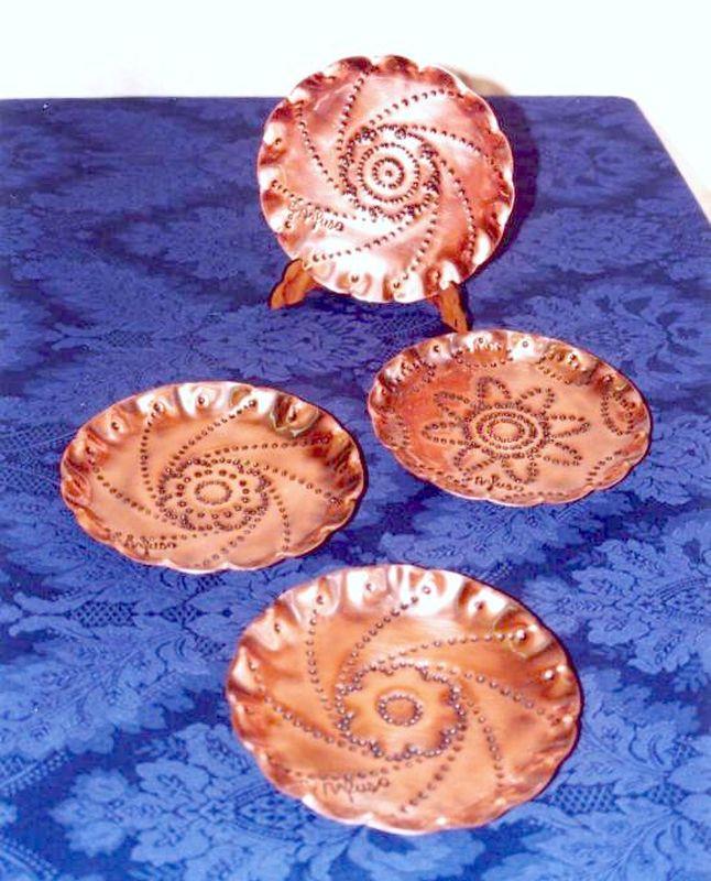 Piattini da appendere o appoggio in rame, puntinati, sbalzati e imbruniti, resi lucidi, anche per tutta la circonferenza è puntinato seguendo un certo ordine, motivo decorativo della Magna Grecia. Il manufatto è armonioso ed elegante.Ogni manufatto viene lavorato interamente a mano, il rame non si ossida rimane inalterato nel tempo, tutti i pezzi sono unici e firmati dal maestro. Completo di forellino per appendere. Può essere usato anche come svuota tasche o contenere cioccolatini ecc..