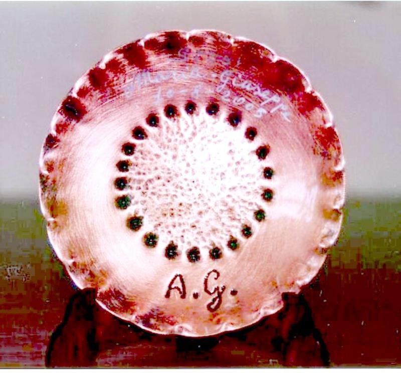 Ciotolina, da appoggio in rame, puntinato, sbalzato e imbrunito, reso lucido, per tutta la circonferenza è puntinato seguendo uno schema continuativo che racchiude il manufatto semi prezioso.  Su richiesta si esegue la dicitura in argento indelebile, realizzata a mano. Il manufatto è armonioso ed elegante e versatile. Può essere usato anche come svuota tasche o contenere cioccolatini ecc.. Ogni manufatto viene lavorato interamente a mano, il rame non si ossida rimane inalterato nel tempo, tutti i pezzi sono unici e firmati dal maestro.