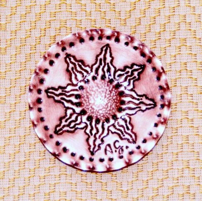 Piattino, da appoggio o appendere in rame sole, puntinato, sbalzato e imbrunito, reso lucido, anche per tutta la circonferenza è puntinato seguendo un certo ordine, motivo decorativo della Magna Grecia, su richiesta dicitura in argento indelebile, realizzata a mano. Il manufatto è armonioso ed elegante.Ogni manufatto viene lavorato interamente a mano, il rame non si ossida rimane inalterato nel tempo, tutti i pezzi sono unici e firmati dal maestro. Completo di forellino per appendere. Può essere usato anche come svuota tasche o contenere cioccolatini ecc..