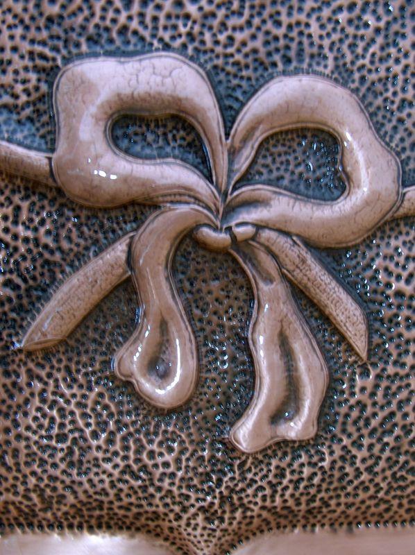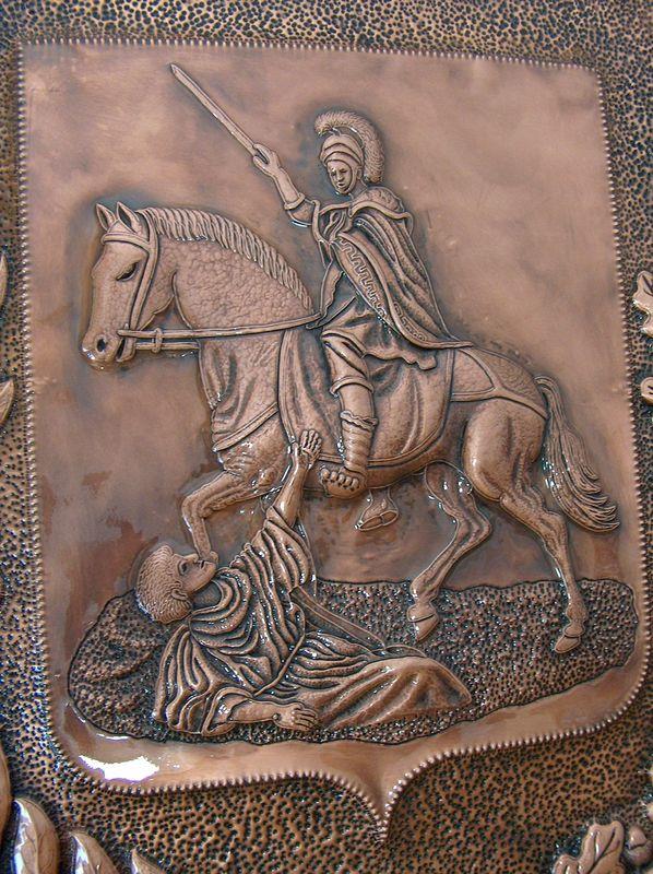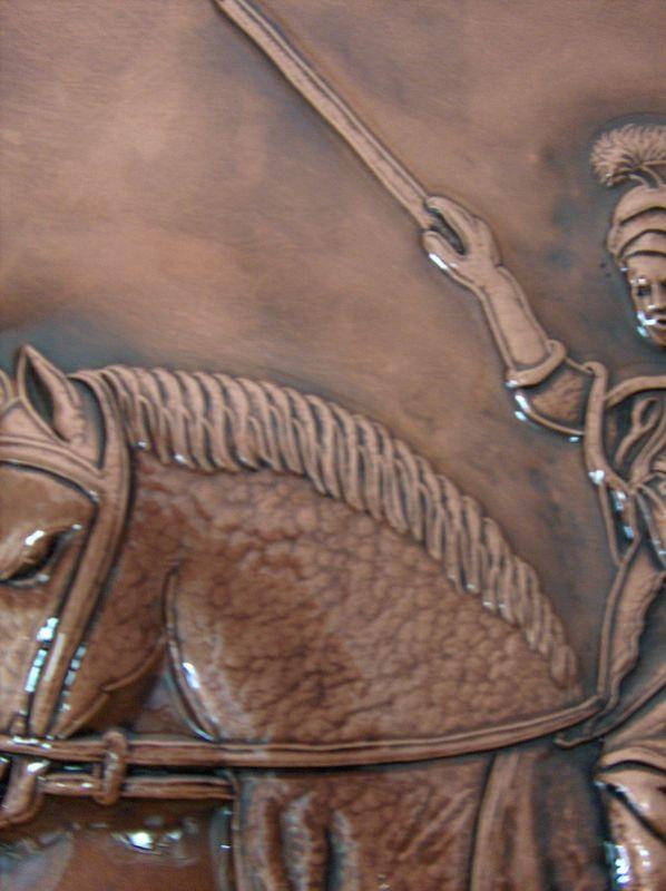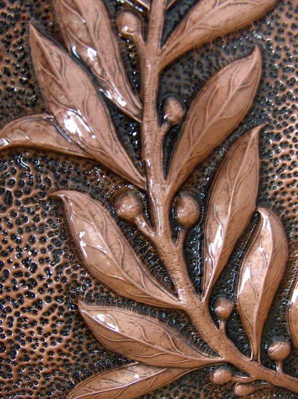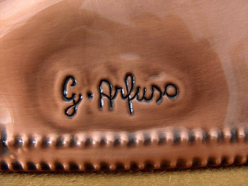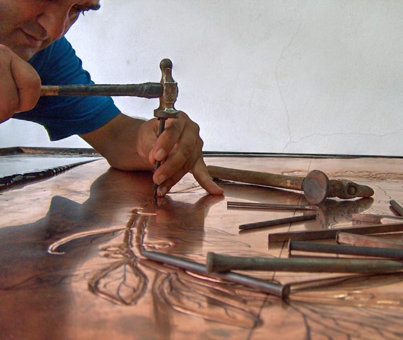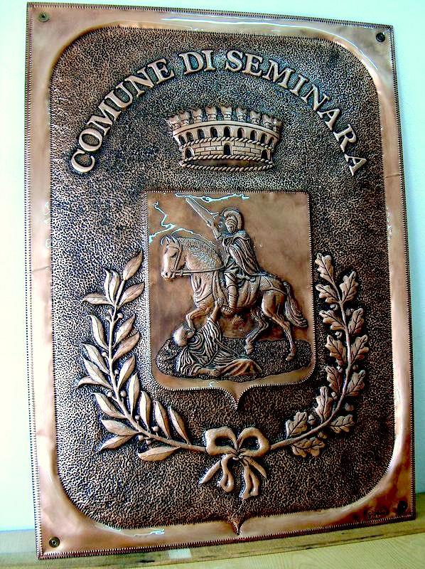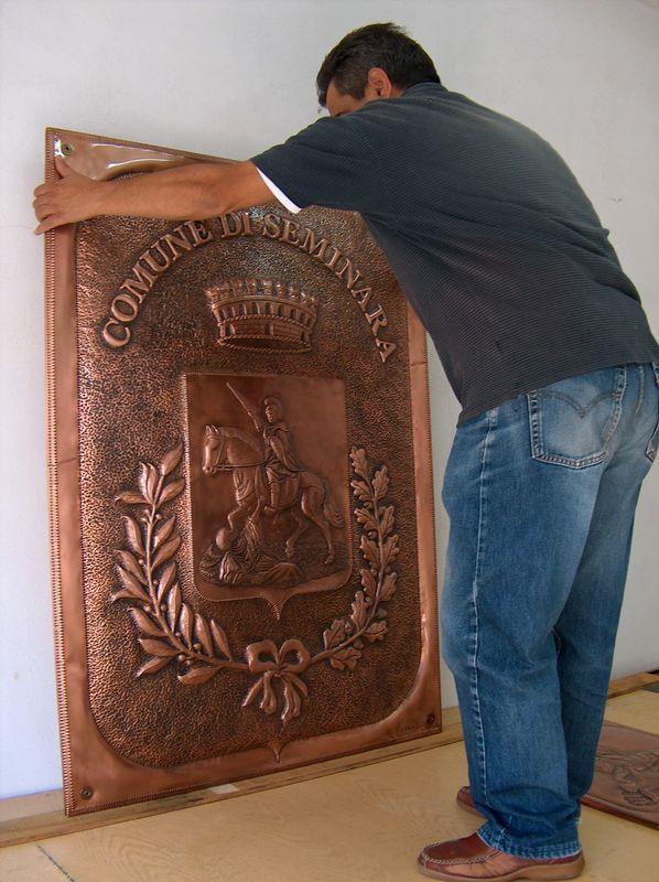 Lo stemma comunale è lavorato a mano, con il seguente procedimento, viene eseguito il progetto, riportato sul rame attraverso il foglio lucido. Viene eseguito il cesello lo sbalzo la puntinatura la martellatura, viene lavorato sia dal diritto che dal rovescio.La lastra viene piegata lateralmente eseguita la chiusura, viene imbrunito, lucidato per poi passare alla fase finale, in questo caso viene reso lucido. Ogni manufatto viene realizzato interamente a mano, non si ossida anche a contatto con l'acqua, rimane inalterato nel tempo, tutti i pezzi vengono firmati dal maestro.