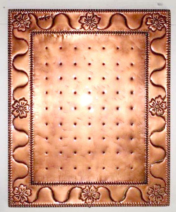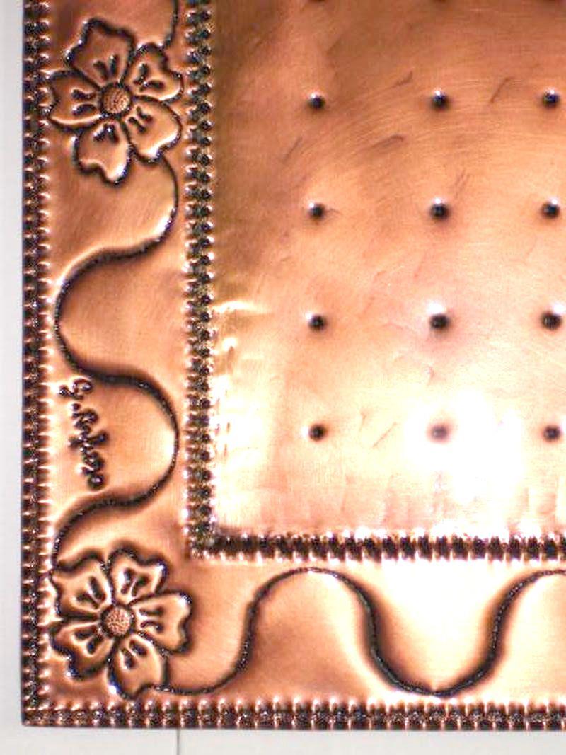Specchio rettangolare o porta poster in rame motivo floreale, lavorato interamente a mano, cesello , sbalzo, martellato, puntinato, imbrunito e reso lucido. Curato nei minimi particolari, mentre per tutto il perimetro segue il motivo decorativo, con un certo schema. Lo specchio è realizzato con unica lastra in rame, è armonioso ed elegante. Ogni opera viene lavorato interamente a mano, il rame non si ossida rimane inalterato nel tempo, tutti i pezzi sono unici e firmati dal maestro.