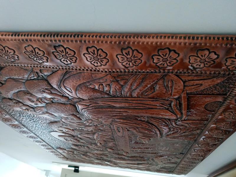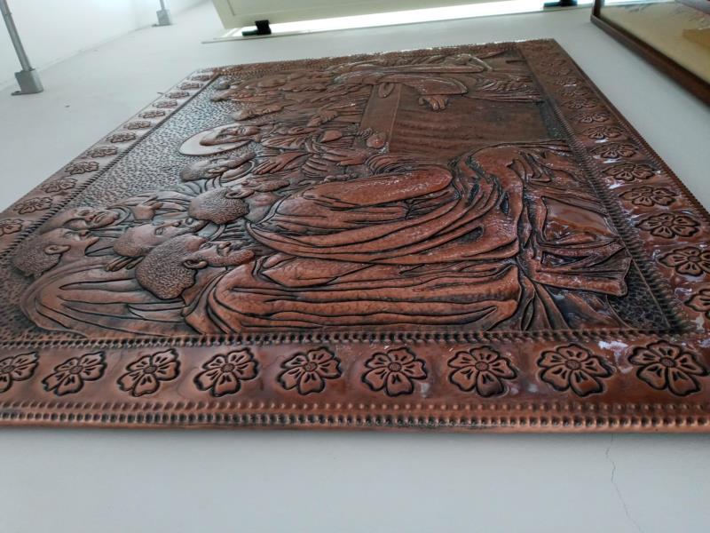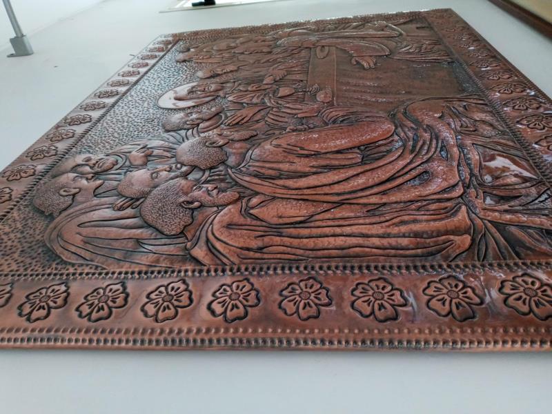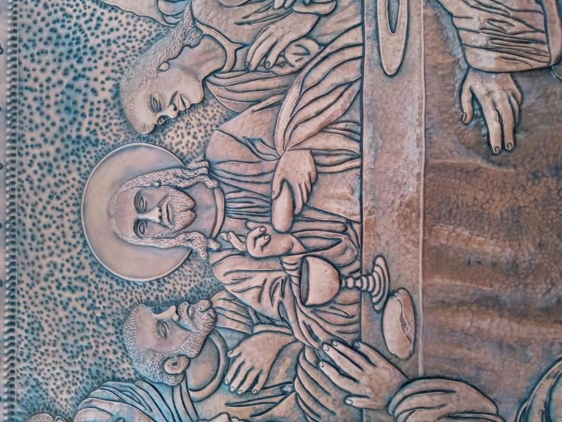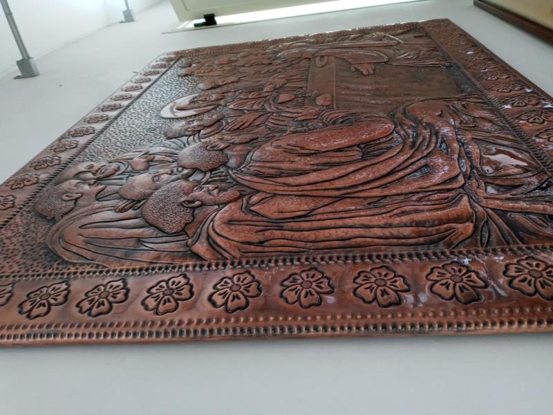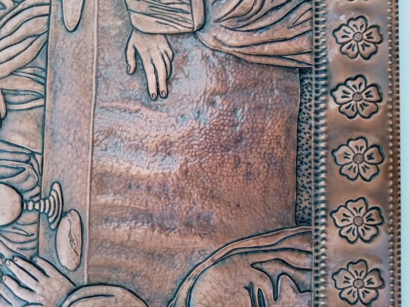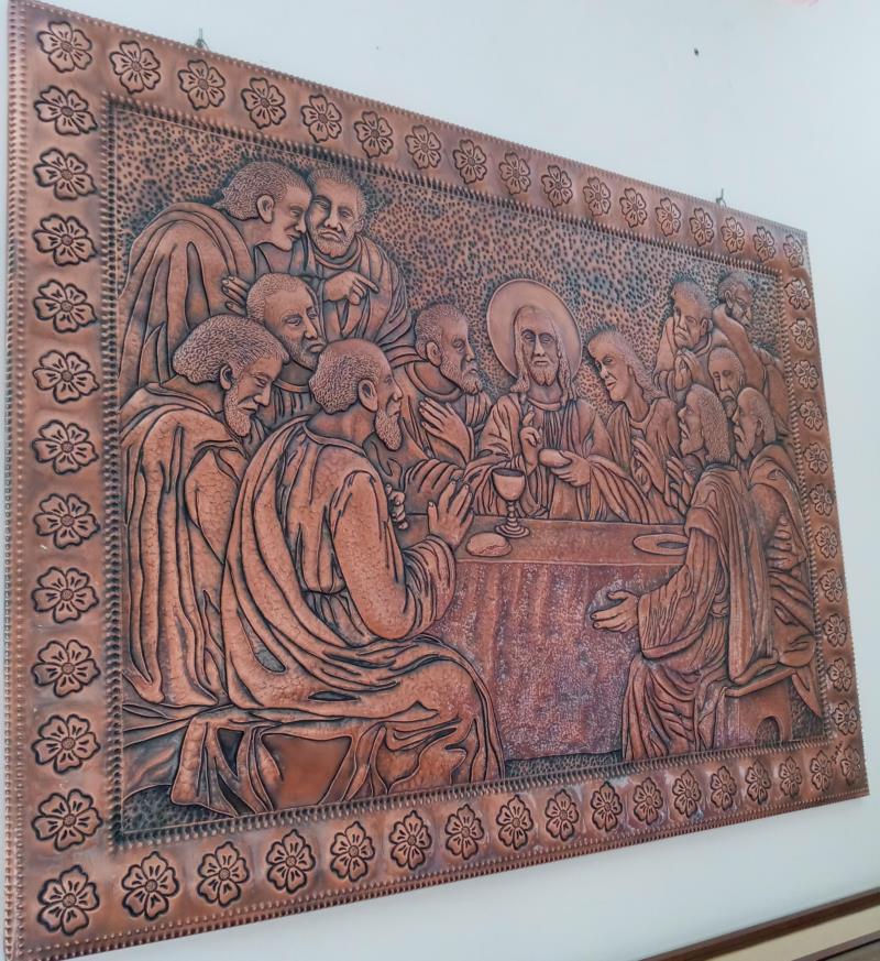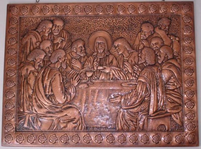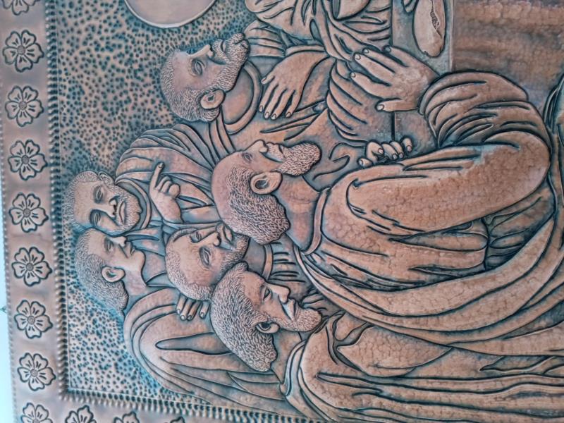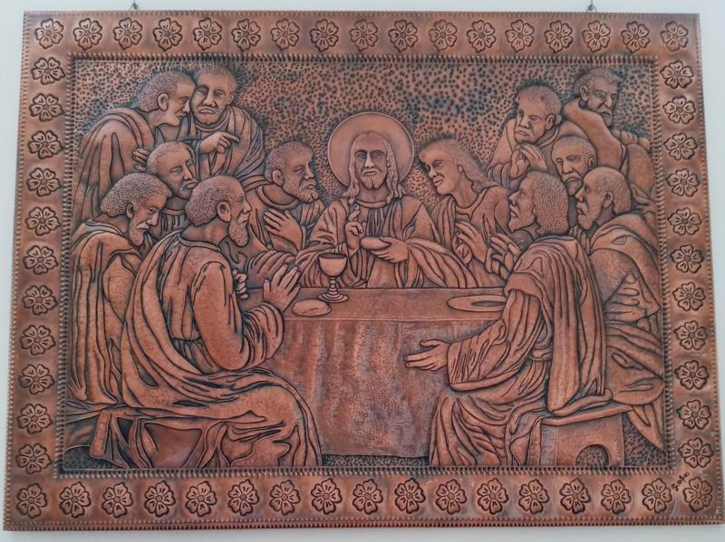 Quadro, Opera Ultima Cena, unico esemplare su rame, lavorato interamente a mano a sbalzo e cesello, martellato, puntinato ed imbrunito e reso ludico. Curato nei minimi particolari, non solo nelle figure presenti che sono tredici, ma anche l'ambiente circostante, la tavola bandita... e la gioiosità, l'attenzione per il momento che gli apostoli stanno condividendo con il Messia...l'opera è illuminata da Gesù centrale, centrale nell'uomo. Il tutto racchiuso in una cornice di fiori sbocciati. Le opere sono tutti realizzati in un'unica lastra di rame, sono pezzi sono unici e firmati dal maestro.