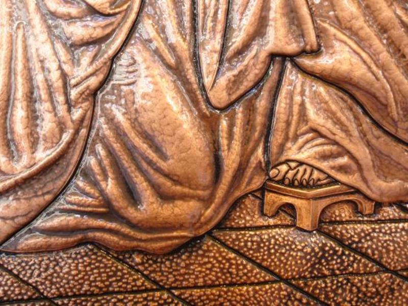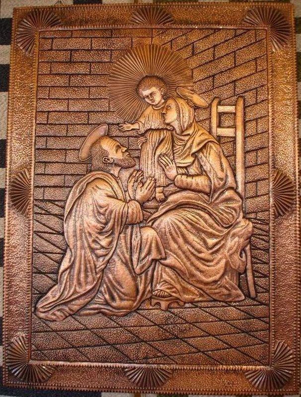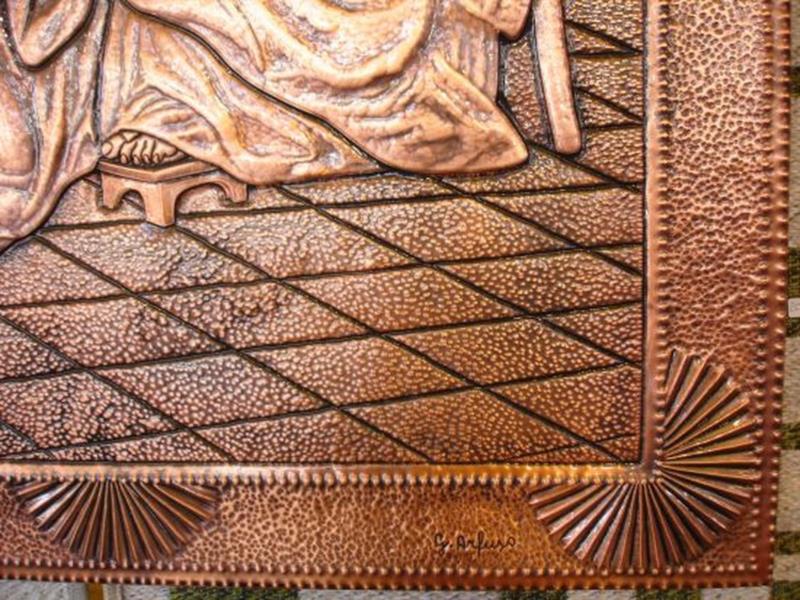 Quadro, Opera Sacra Famiglia, unico esemplare su rame, lavorato interamente a mano a sbalzo e cesello, martellato, puntinato ed imbrunito e reso lucido. Curato nei minimi particolari, non solo nelle figure presenti che sono tre, ma anche l'ambiente circostante, la prospettiva,la stanza e la sedia con lo sgabello dove la Madre appoggia il piede...la gioiosità, l'attenzione per il Bambino, consapevolezza che è il Figlio di Dio, l'opera irradia la potenza di Gesù centrale. centrale nell'uomo. Il tutto racchiuso in una cornice composta da raggi alternati da una martellatura che si espande in tutto il quadro.