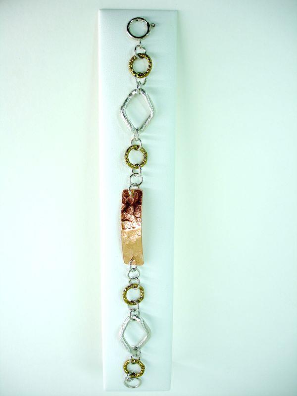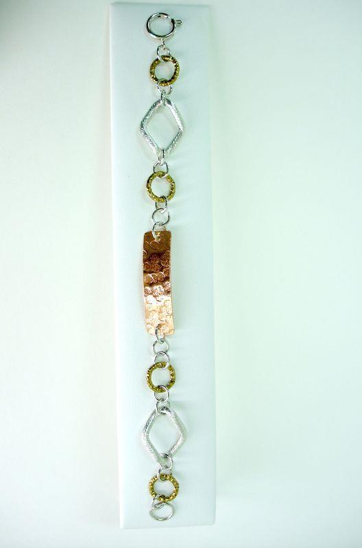 Bracciale in rame, martellato, imbrunito, lucido con metallo inossidabile, silver e rame, lungo cm 19.