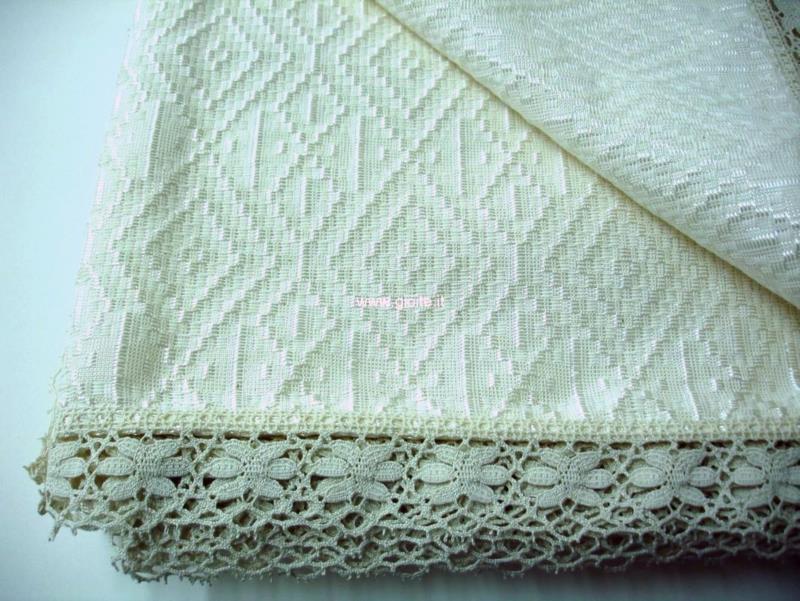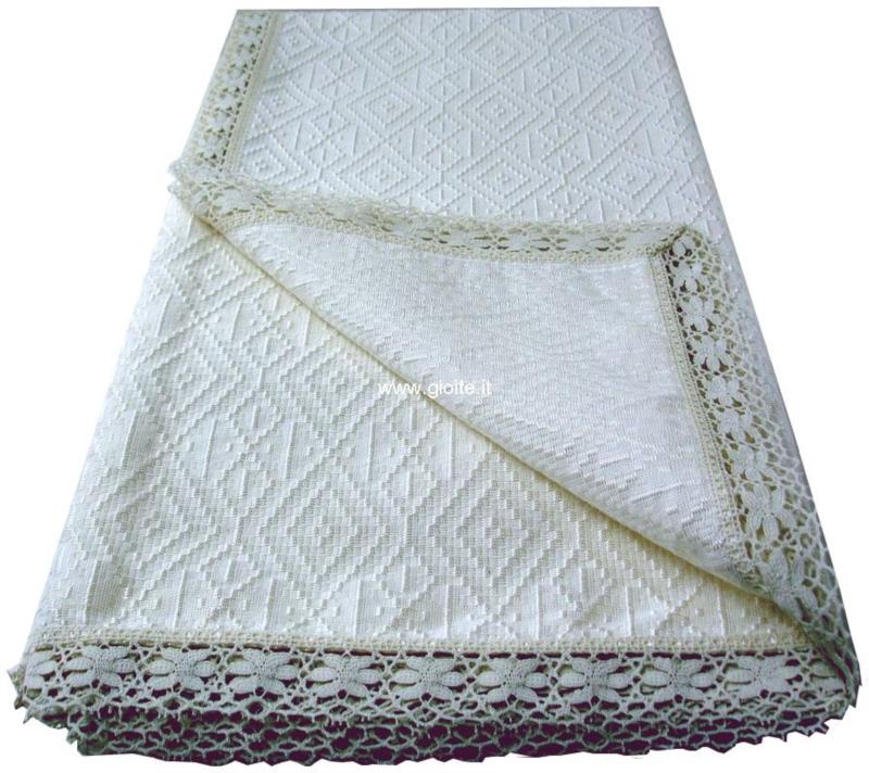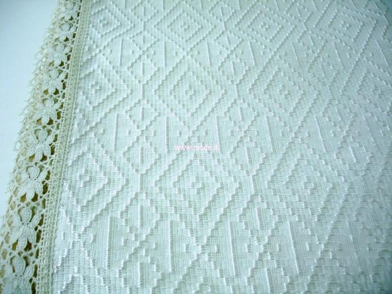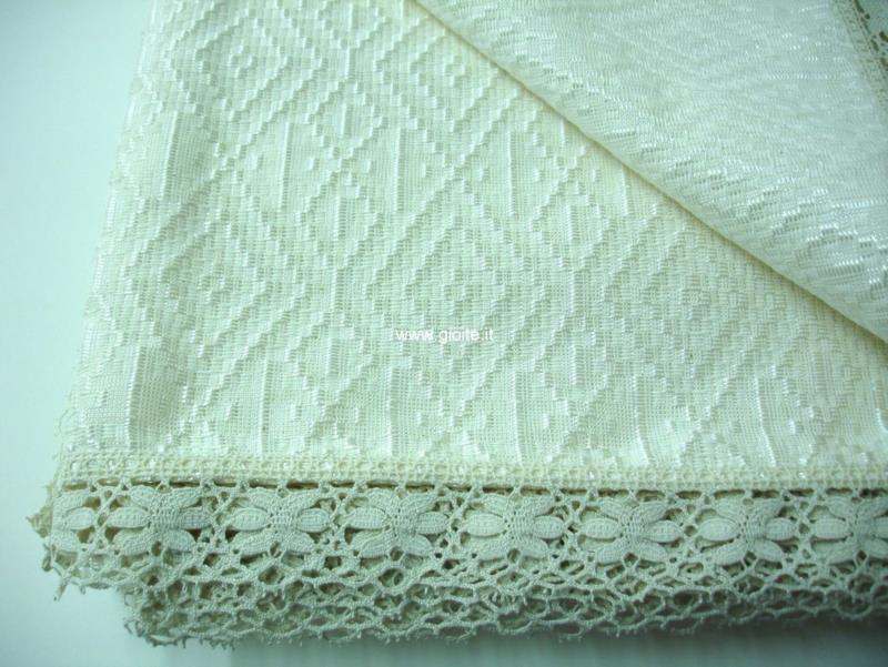 Copriletto matrimoniale in seta sintetica, colore avorio con motivo decorativo della Magna Grecia, rombi incastrati. Tessuto molto elegante resistente si lava tranquillamente in lavatrice a freddo, misure molto ampie, rifinita con pizzo di 5 cm.