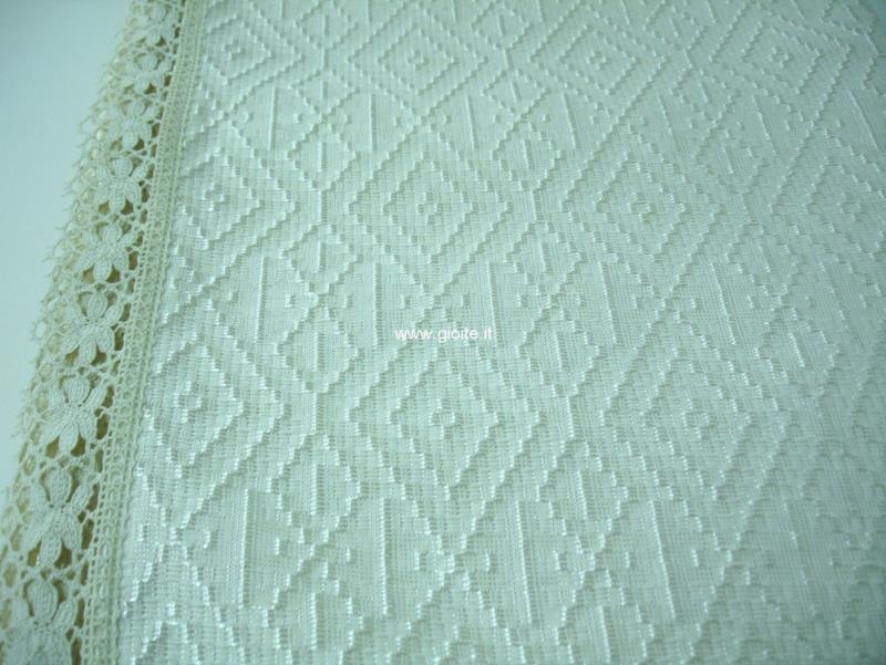 Copriletto matrimoniale in seta sintetica avorio motivo antico della Magna Grecia con frangia lavorazione artigianale che richiamano le rose Produzione Gioite fatto a mano artigianato Calabrese Semina