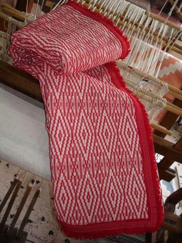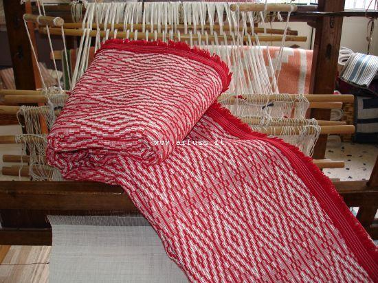 Coperta matrimoniale in tessuto di lana colore rosso filato naturale con frangia fatto a mano disegni della Magna Grecia
