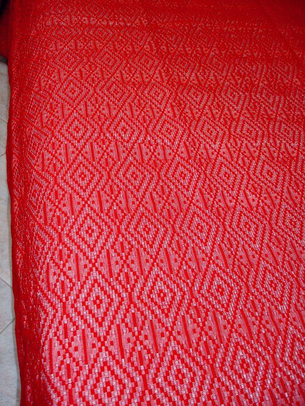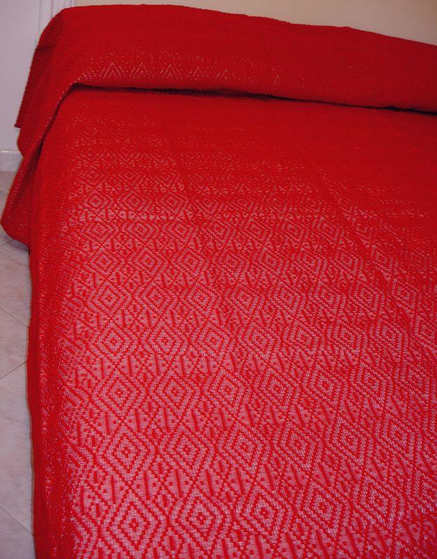 Coperta matrimoniale di pura lana bordata colore rosso profondo rubino disegno a rombi artigianato Calabrese produzione Made in Italy da Gioite fatto a mano bordata con nastrino rosso intenso compatta