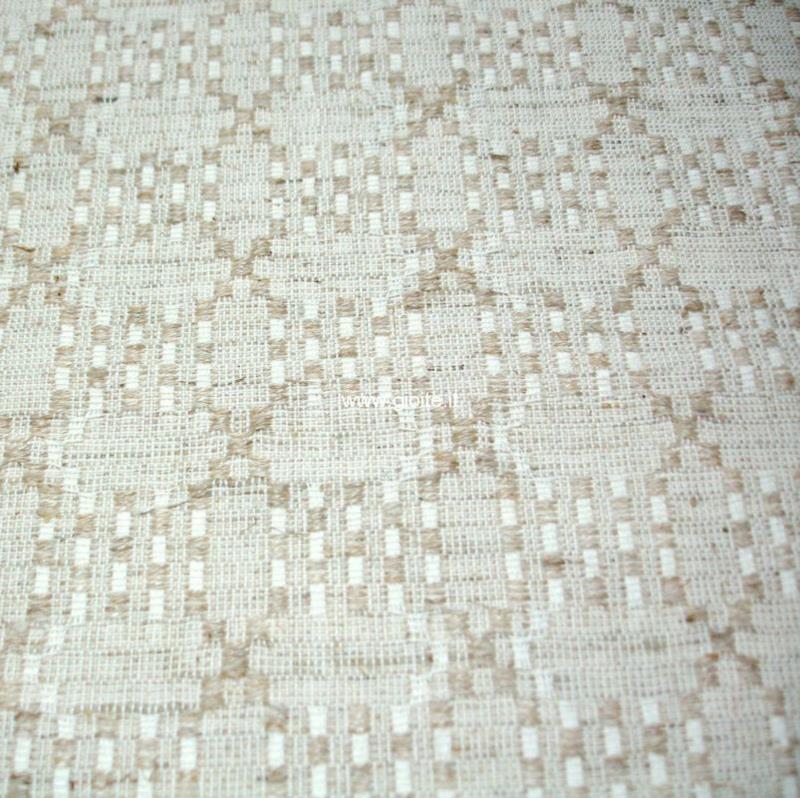 Copri tavolo in lino, motivo detto mattonella per il suo intreccio particolare. Il tessuto è in trama lino e l'ordito di colore naturale, attraverso questo procedimento di intreccio si rende più visibile il motivo decorativo. E' un tessuto morbido resistente, si lava in lavatrice a 60° se si desidera mantenere il colore naturale, altrimenti si può lavare anche a temperature alte, schiarisce soltanto.