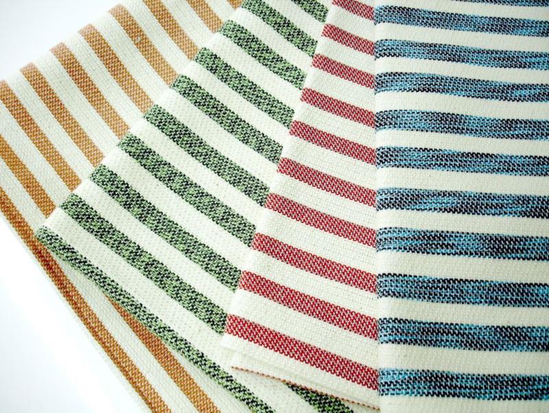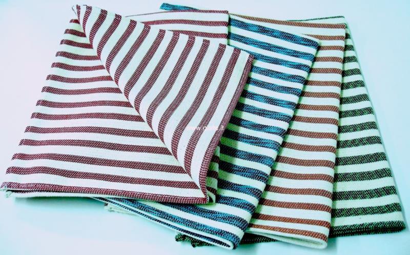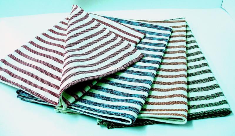 Strofinacci in puro cotone, tessuto operato eseguito a due colori con delle strisce di cm 1. Lo strofinaccio è orlato mentre le sue dimensioni sono di cm 50 x 70.