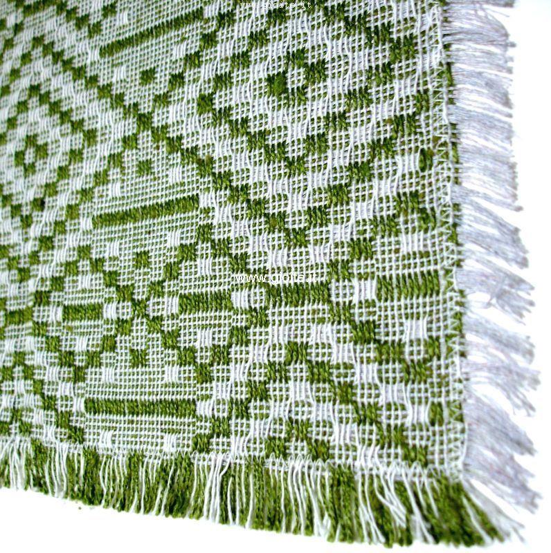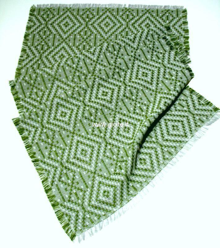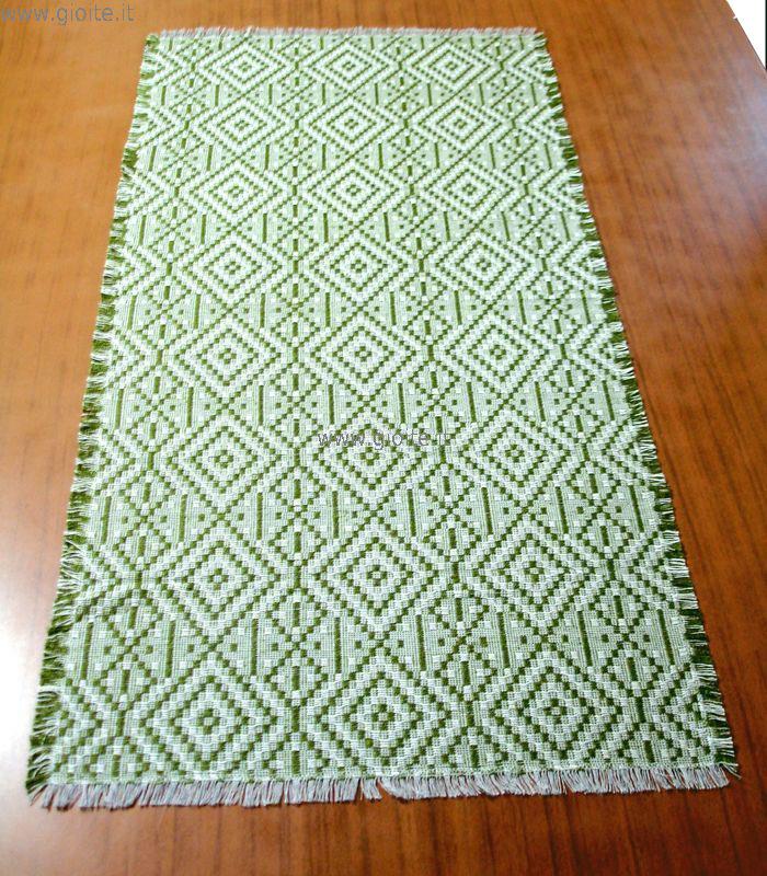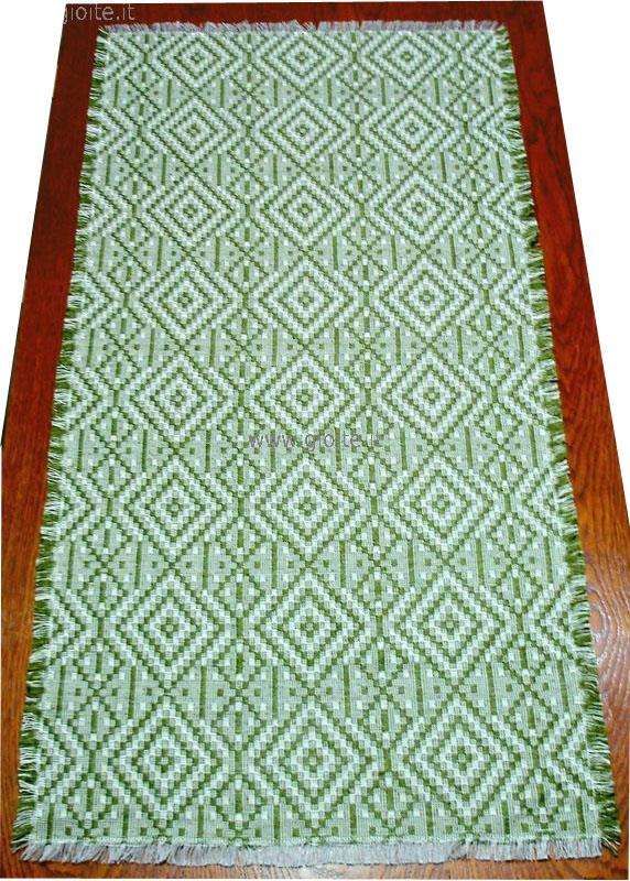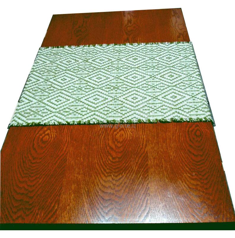 Runner - guida da tavola in seta antichizzata di colore verde. Tessuto operato a rombi incastrati, molto armonioso ed elegante. Si adatta a tutte le esigenze di arredo. Manufatto resistente, lavabile in lavatrice a 60° candeggiare per colori. Disponibile anche centro tavolo, vedere sulla voce centro tavoli.